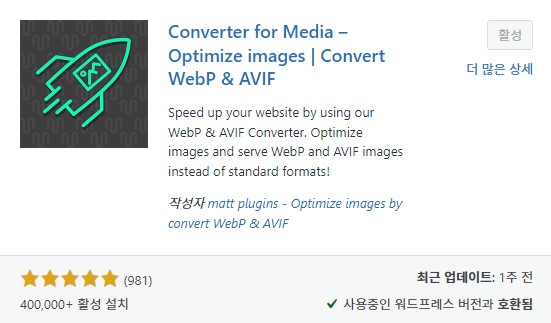 - 플러그인 설치: 워드프레스 관리자 대시보드에서 '플러그인' > '새 플러그인 추가'를 선택한 후, 'Converter for Media'를 검색하여 설치하고 활성화합니다.